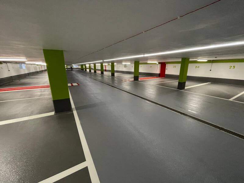 Komplette Instandsetzung der Stahlbeton- Konstruktion. Abtrag der geschädigten Betonsubstanz mittels Höchstdruck-wasserstrahltechnik. Einbringen von Ersatzbeton. Auftragen verschiedener Oberflächenschutz- Beschichtungen. Durchführung der Arbeiten unter laufendem Parkhausbetrieb.